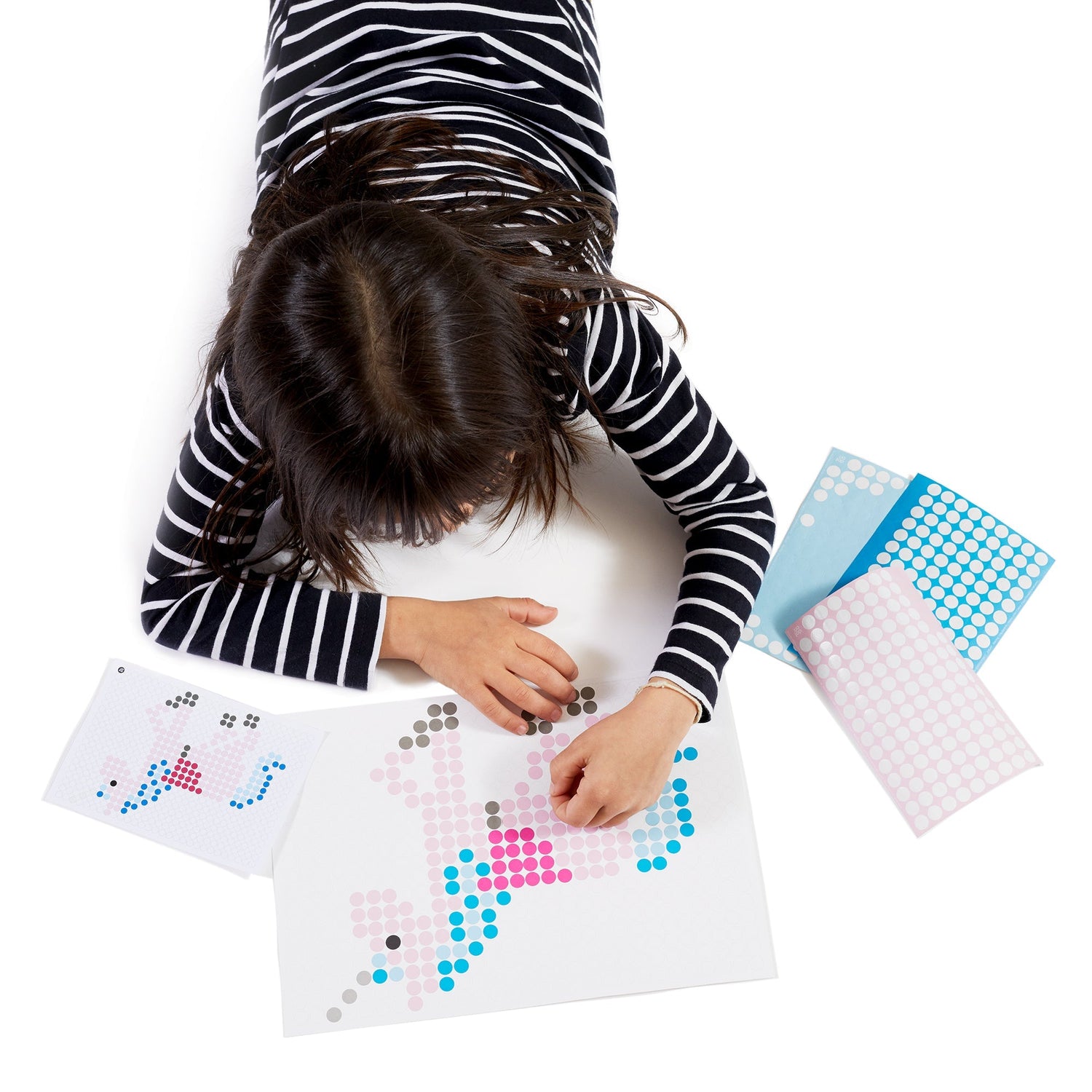 Kies eenvoudig het motief, kies de kleuren van de lijmstippen en plak ze er dan op! Beetje zoals schilderen op nummer maar dan met stickers.