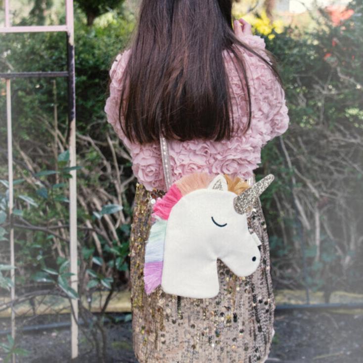 Deze regenboog eenhoorntas is gemaakt van superzachte witte glitter met een felgekleurde regenboog manen en een glitterende gouden hoorn. Deze tas heeft een magnetische stippensluiting, een gouden sterrenvoering en een verstelbare gouden riem met een breekpunt voor de veiligheid.